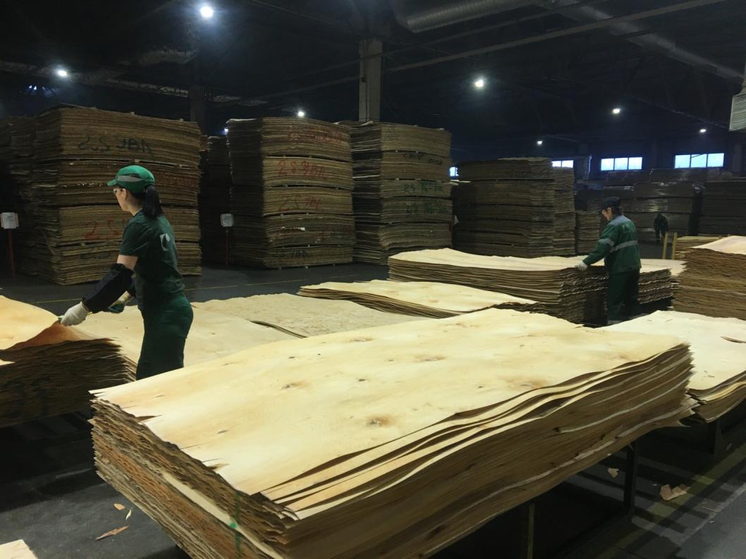 Производство фанеры - процесс сложный и многоэтапный. Сначала стволы деревьев проходят гидротермическую обработку, они варятся в варочных бассейнах 24 часа, в которых температура воды 52 градуса. Затем с поверхности ствола удаляются кора и луба, потом бревна прогоняют через специальный сканер, определяющий кубатуру. После чего они попадают на лущильные станки для лущения шпона, получившаяся лента шпона подается к пневматическим ножницам для раскроя на форматные листы, которые стопками подается к сушилке. После сушки шпон делится на несколько частей, одна из которых направляется на склеивание или шпонопочинку, а другая – сразу на сортировку в соответствии с требованиями заказчика. С помощью шпонопочинки можно увеличит сорт шпона, вырезав сучки. Затем идет процесс склеивания, после чего шпон с нанесенным клеем отправляется на прессовку, где формируются листы фанеры. Листы обрезаются, шлифуются и сортируются в стандартные транспортировочные пачки.