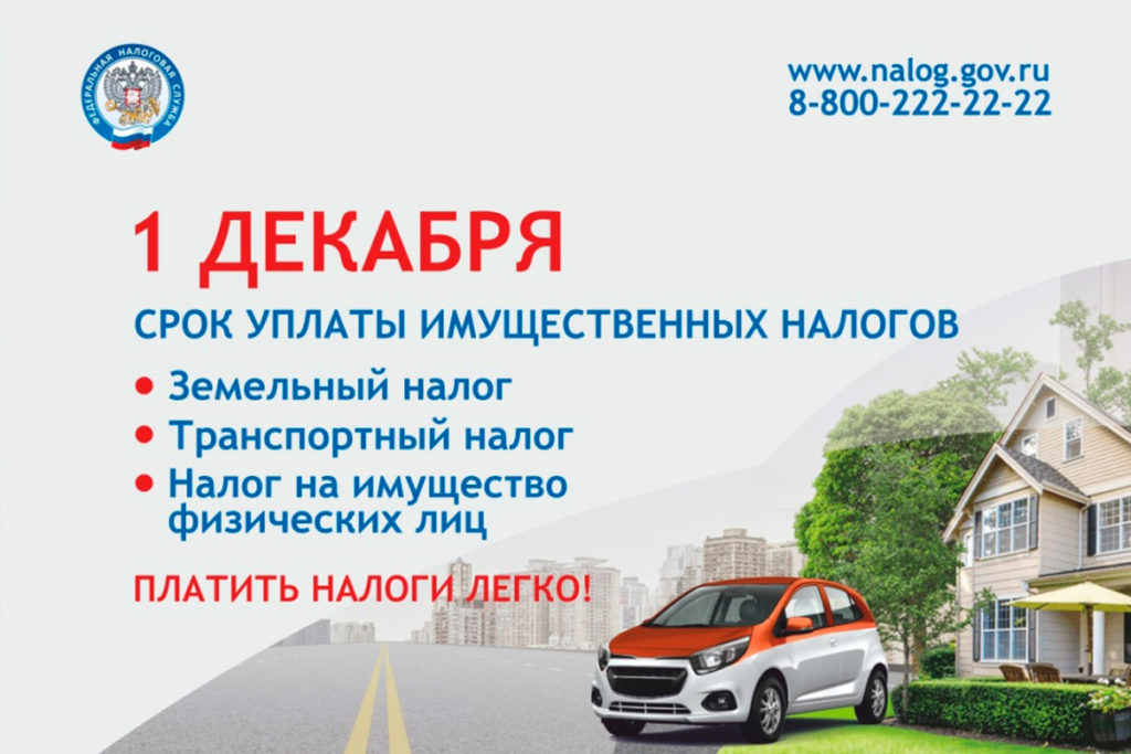 Срок уплаты имущественных налогов: земельный налог, налог на дом, квартиру, транспортный налог – 1 декабря этого года.