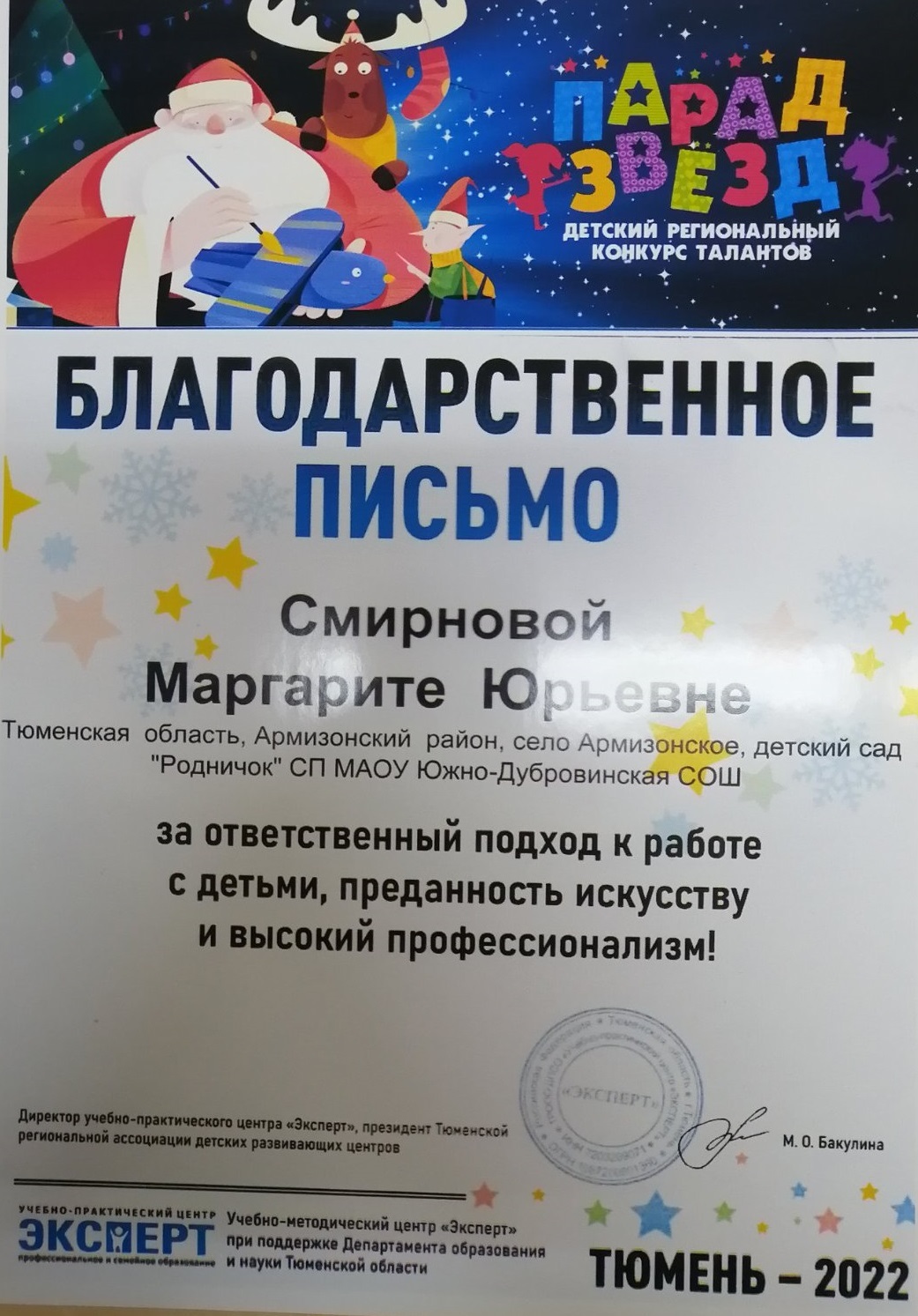 За ответственный подход к работе с детьми, преданность искусству и высокий профессионализм Благодарственным письмом награждена воспитатель маленькой Жени Смирнова Маргарита Юрьевна.