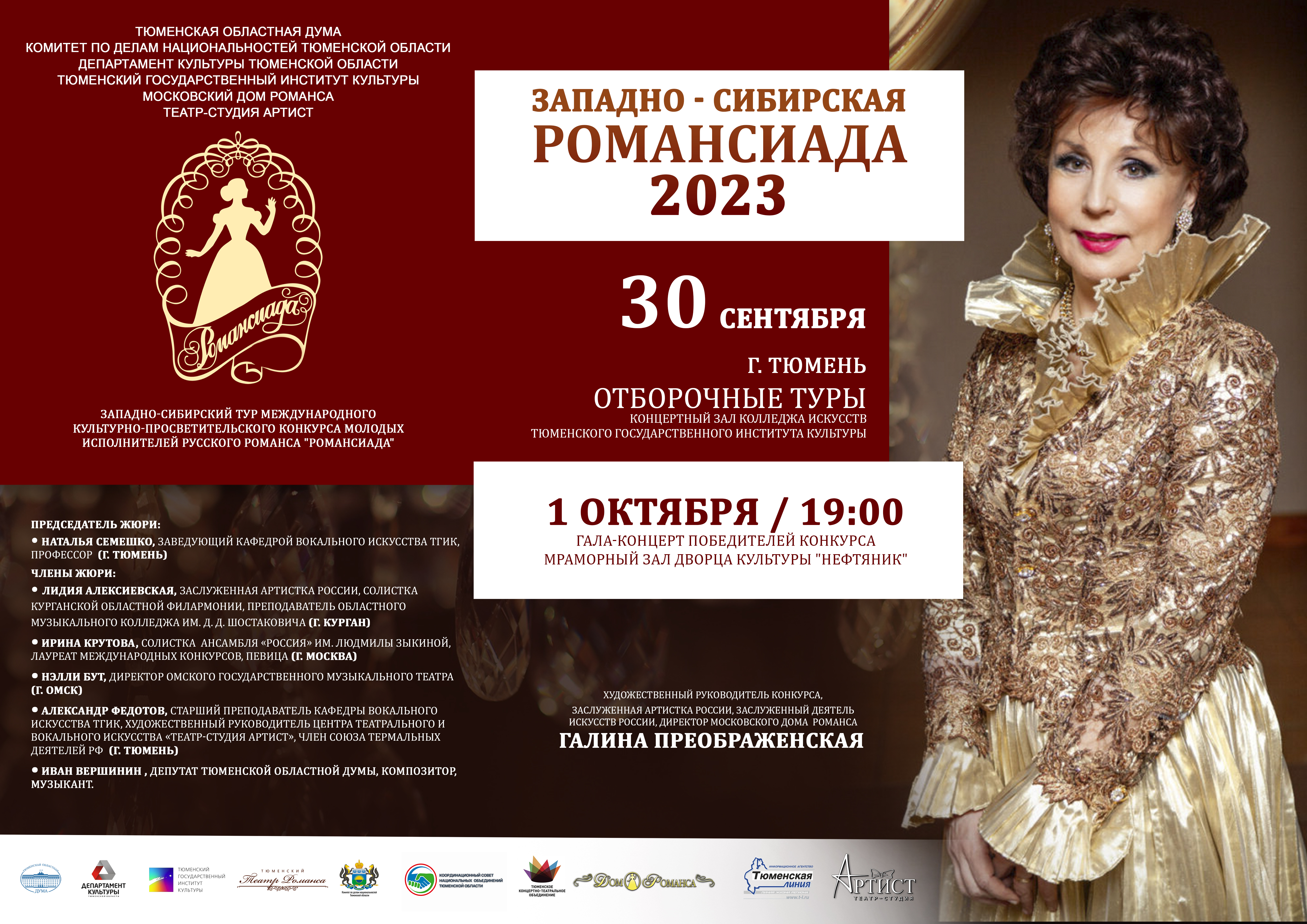 1 октября в 19 часов в мраморном зале ДК "Нефтяник" состоится гала-концерт, подлинным украшением которого станут выступления лауреатов, гостей и членов жюри, возглавляет которое Заслуженная артистка России, Заслуженный деятель искусств России, директор Московского дома романса, художественный руководитель «Романсиады» Галина Преображенская и профессор кафедры вокального искусства Тюменского государственного института культуры, директора колледжа искусств ТГИК, исполняющий обязанности директора регионального учебно-методического центра развития системы дополнительного образования детей в сфере искусств в Тюменской области, лауреат международных и всероссийских конкурсов Наталья Семешко.