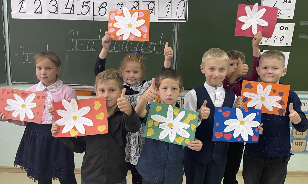 Вместе класс составил плакат с добрыми качествами человека, которые ребята напечатали на лепестках ромашки, сделанной своими руками для бабушек и дедушек.