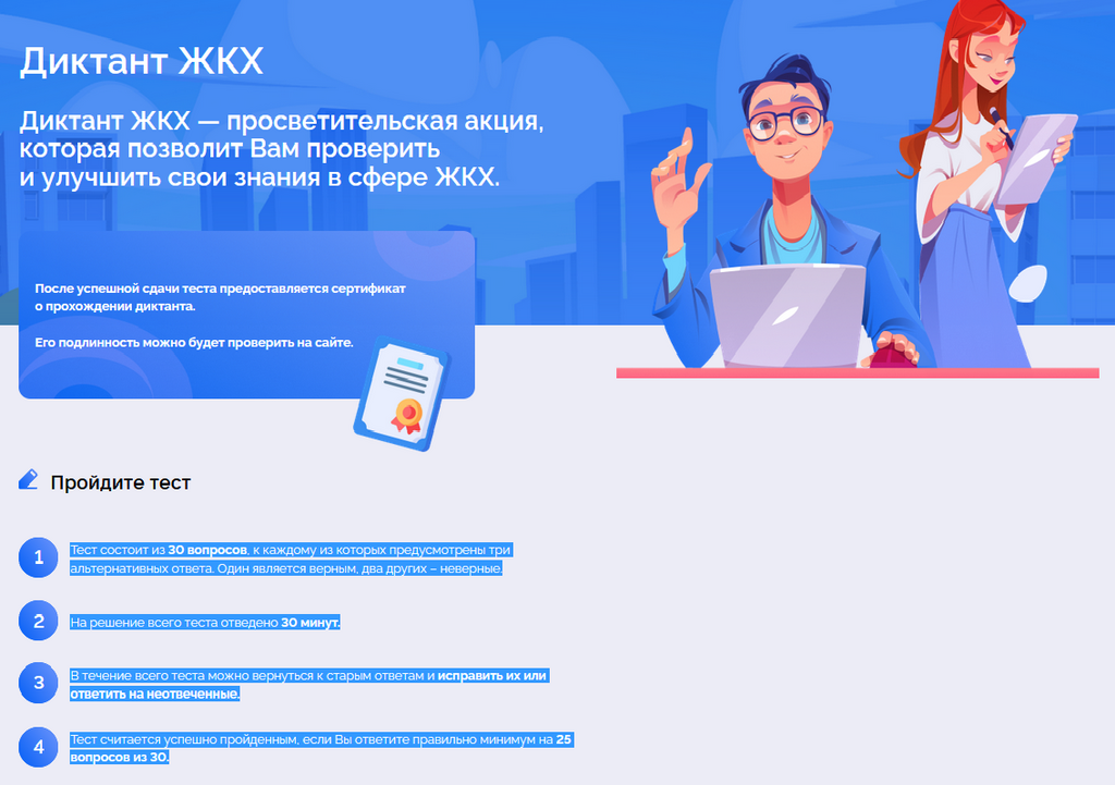 В тесте 30 вопросов по управлению многоквартирным домом, предоставлению услуг ЖКХ, защите прав потребителей в этой сфере. К каждому из них предусмотрены три альтернативных ответа. Один является верным. На решение всего теста отведено 30 минут. В течение всего периода можно вернуться к старым ответам и исправить их или ответить на не отвеченные. Задание считаются успешно пройденным, если даны правильные ответы минимум на 25 вопросов из 30.