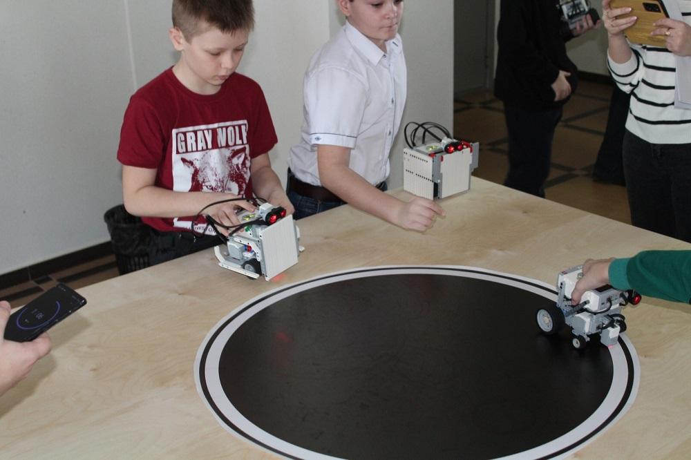 Первая - «Робо-сумо». Цель – оттеснить робота соперника за пределы поля-круга диаметром 72 сантиметра. Состязалась 21 команда, в результате первое место завоевала команда МАОУ «Казанская СОШ»