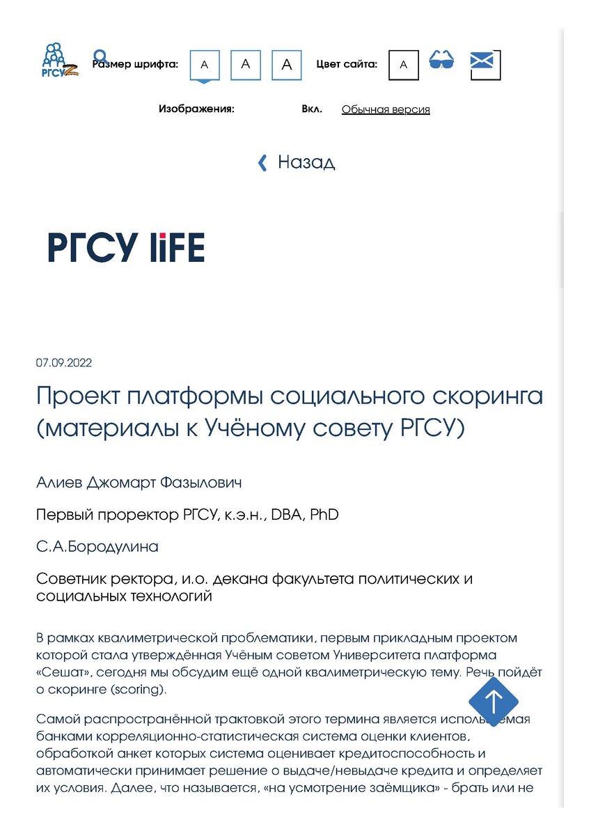 Российский государственный социальный университет (РГСУ) уже разрабатывает и тестирует платформу так называемого “социального скоринга” (по-русски, видимо, уже совсем не могут разговаривать эти господа) под названием «Мы», которая будет формировать социальный рейтинг для россиян на основе различных параметров. Студентам вуза предложили зарегистрироваться на платформе и принять участие в тестировании системы.