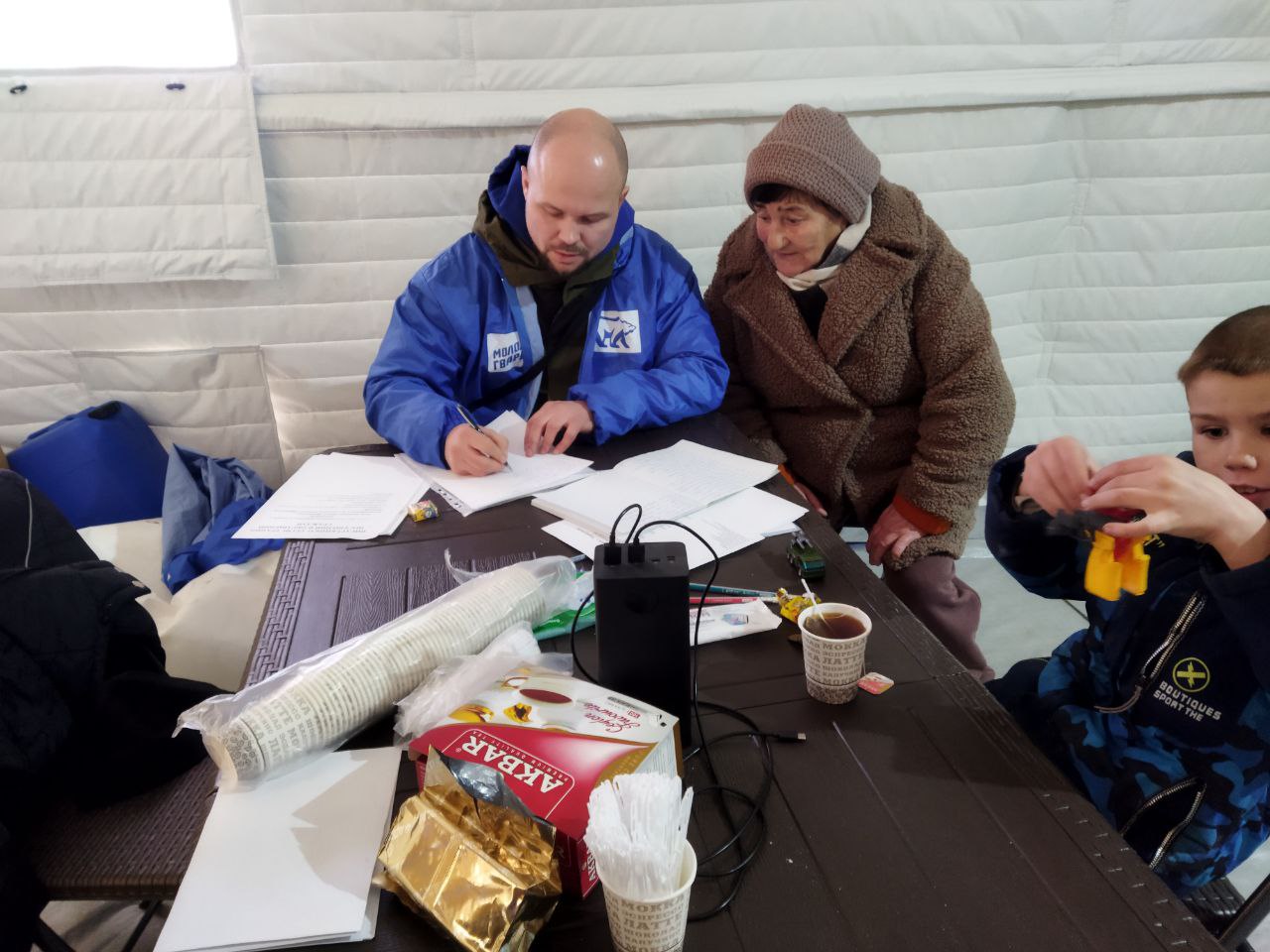 На территории Мариуполя Иван находится с 24 января. Доброволец помогает местным жителям с заполнением заявления на ремонт жилья и поиском утерянных документов. В волонтёрском корпусе всех желающих угощают чаем, детям раздают конфеты.