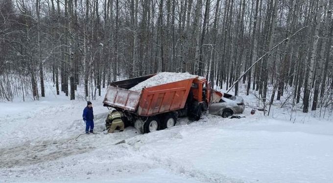 На тюменской трассе самосвал протаранил легковушку