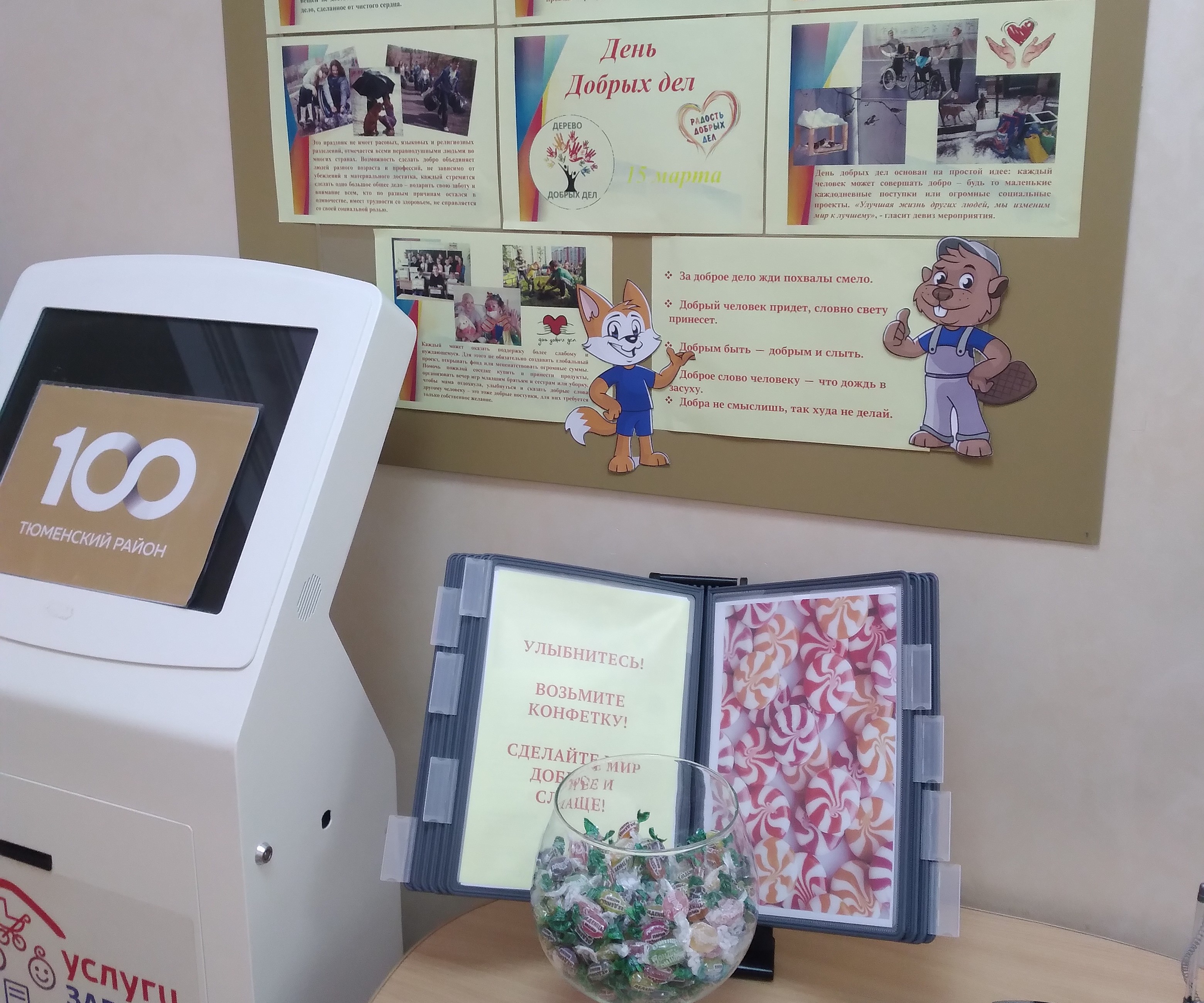Международный день добрых дел в управлении ЗАГС Тюменского района отмечают сегодня, 15 марта. Всех посетителей угощают конфетами и призывают делать добро.