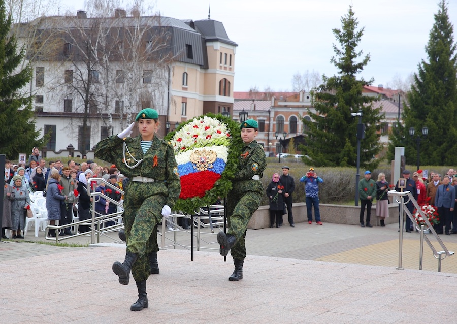 На Площади Победы прошла торжественная церемония возложения цветов, посвященная 79-ой годовщине Победы в Великой Отечественной войны Тоболяки пришли с портретами своих ветеранов.
