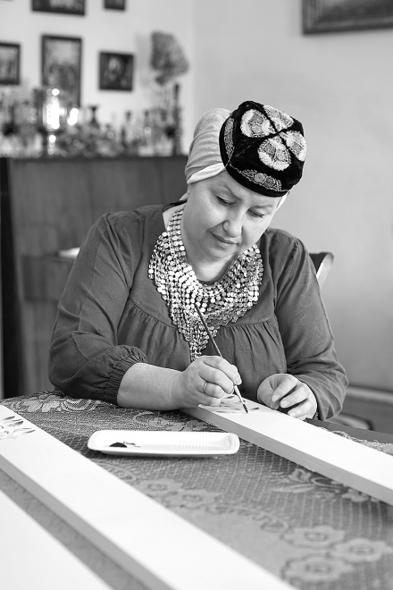 – Центральный цветок тюльпан – символ ислама, от него отходят росточки, корешки – древо жизни. Этот рисунок мы подобрали с Верой Быковой, народным мастером Союза художников России, а расписываю я сама, люблю делать что-то новое, – объясняет Альмира Гумерова, вырисовывая изящные веточки на голубой доске.