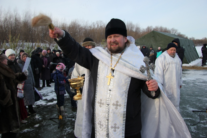 Теперь, после службы, к иордани устремляются верующие. Становятся на колени, омывают лицо, наполняют водой пластиковые канистры. Следом на троекратное погружение в купели идут смельчаки. Каких-то двадцать минут - и площадка пустеет. Всё-таки рабочий день, хотя в некоторых организациях верующих сотрудников по случаю праздника руководители отпускают на пару часов. Но основной поток желающих окунуться здесь ждали к вечеру. Экстренные службы оставались до полуночи. По опыту прошлого года можно рассчитывать не менее чем на четыре сотни тех, кто пожелал испытать себя в ледяных купелях.