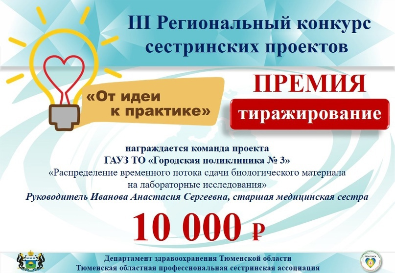 На дня в рамках Дня главной медсестры Поликлиника №3 получила награду III Регионального конкурса сестринских проектов "От идеи к практике" за реализацию проекта по распределению временного потока сдачи биологического мат