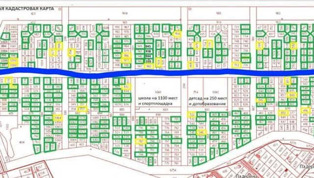 Синяя полоса на снимке - это дорога, которую сейчас начали делать. По плану перспективного развития в непосредственной близости будут строиться садик и школа. Электричество подключают по заявке. Газификации - в плане ближайших 2 лет.